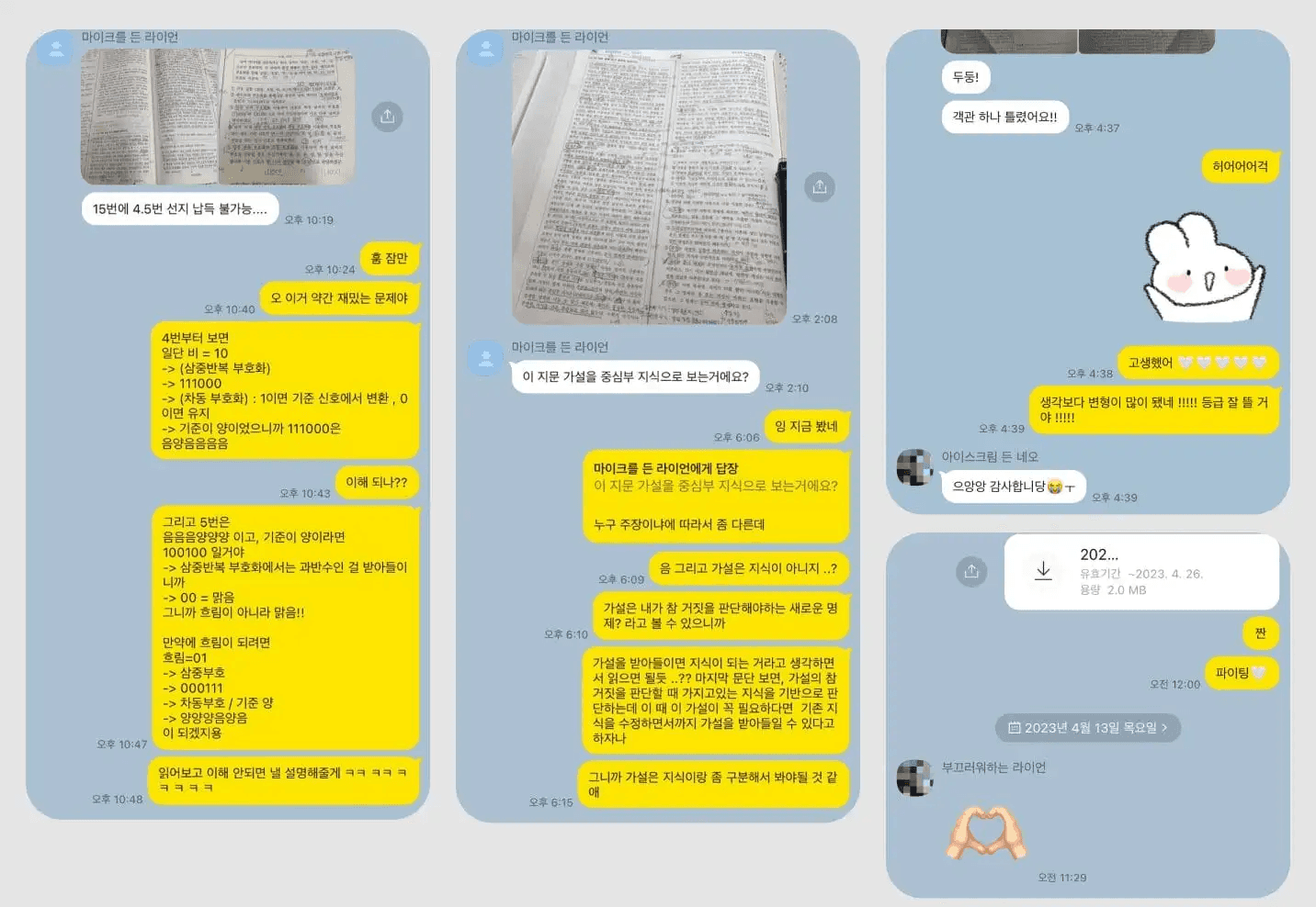 가끔은 이런 적도 있대요. 윤희 쌤 역시 개인적인 사정으로 수업할 시간과 장소가 여의치 않을 때가 있었는데요. 그때 한 학생이 자신은 ‘막사’에서 수업을 듣는다고 하여 서로의 상황을 공유하며 더욱 의지를 다질 수 있었죠.