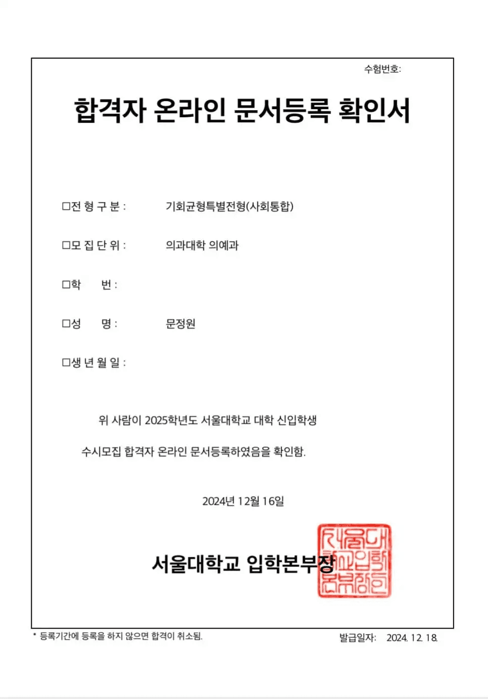 꿈에 그리던 서울대 의대 최종 합격!