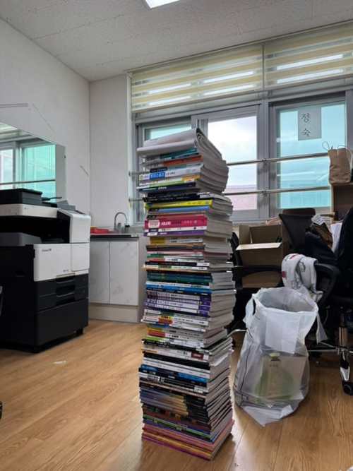 정원이가 공부했던 각종 교재, 입시를 마치고 보니 정원이 키보다 더 높이 쌓여있었어요